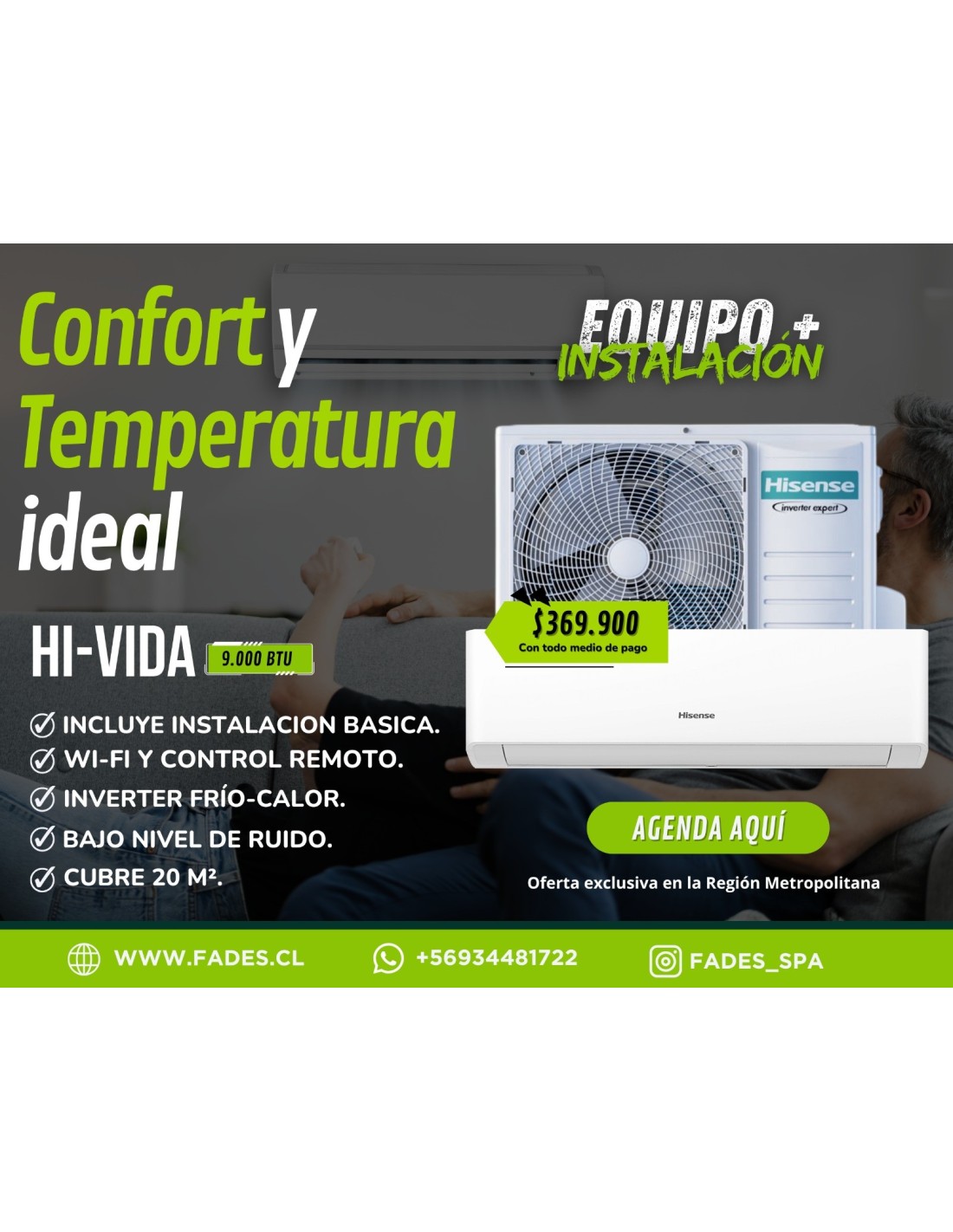 - Instalación Unidad interior en muro de zona a climatizar y unidad condensadora en muro sólido al exterior a 3m (Máximo distancia que cubre el kit de tubería de cobre que incorpora el equipo)
